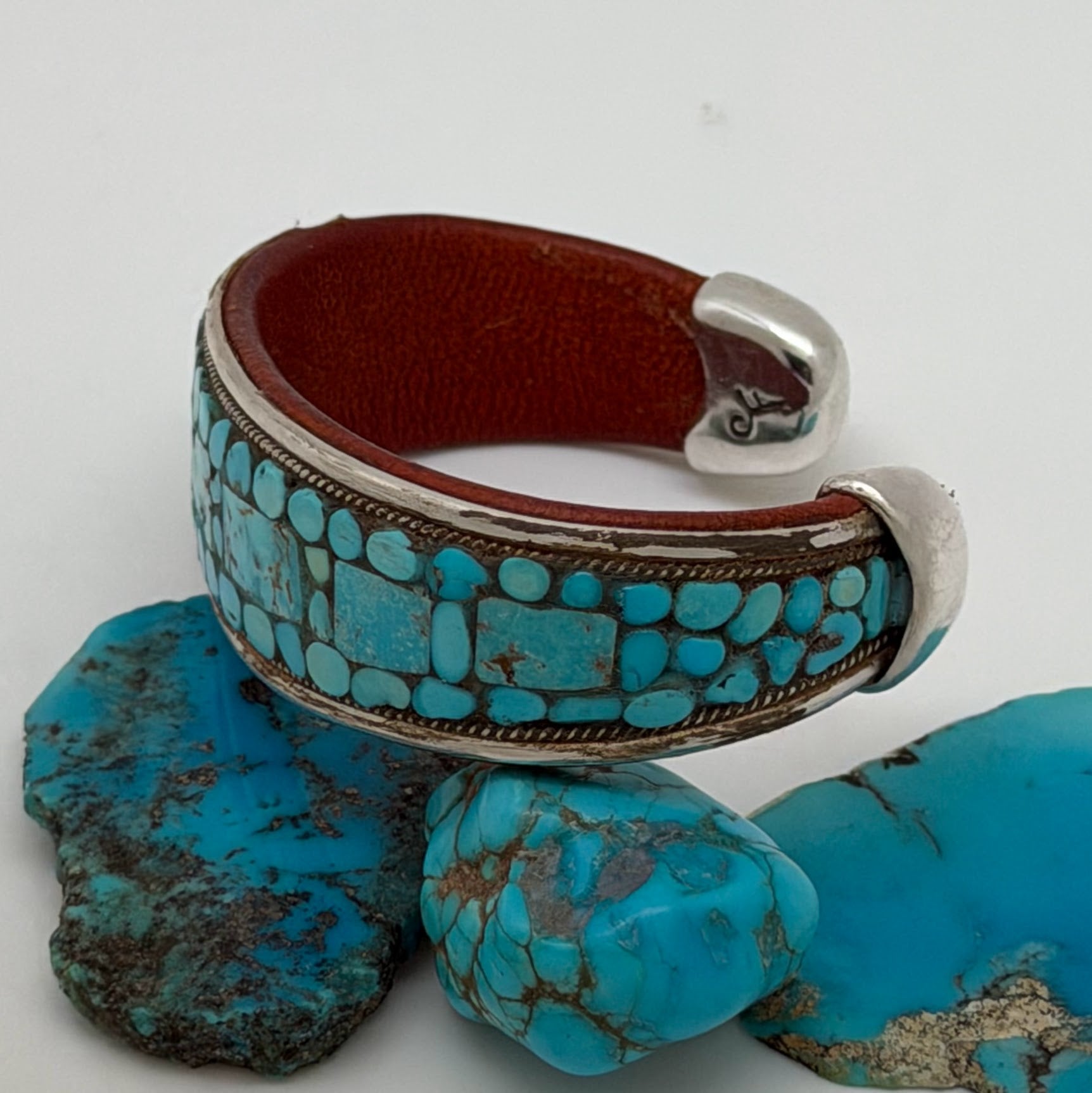 Sterling Silver, Copper, and Leather Cuff Bracelet with Mosaic Inlaid Turquoise. Cuff has Nevada turquoise.